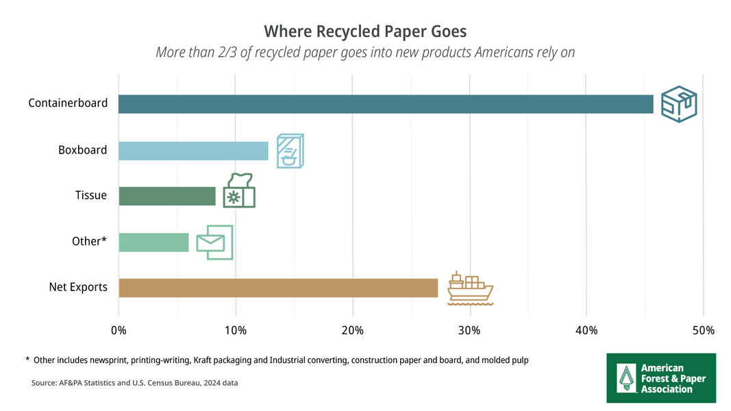 Nearly half of recycled paper, about 20.8 million tons, went into making containerboard in 2024. That’s the material used to make cardboard boxes.