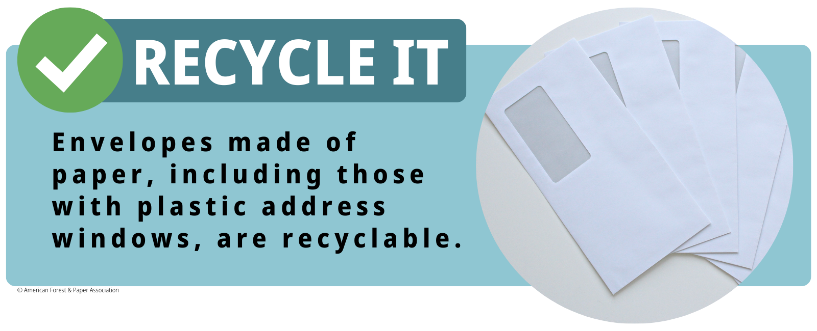 Yes! Envelopes made of paper, including those with plastic address windows, are recyclable. You do not need to remove stamps, labels, or the small plastic windows before recycling.