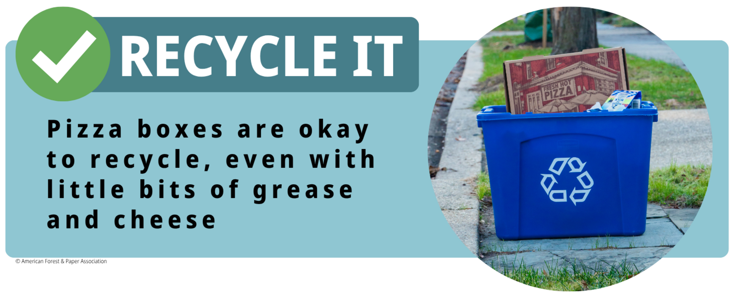 A study found that typical amounts of grease and cheese on pizza boxes are not a problem for paper mills. In fact, paper mills want these boxes back to recycle them—as long as you finish that pizza first!