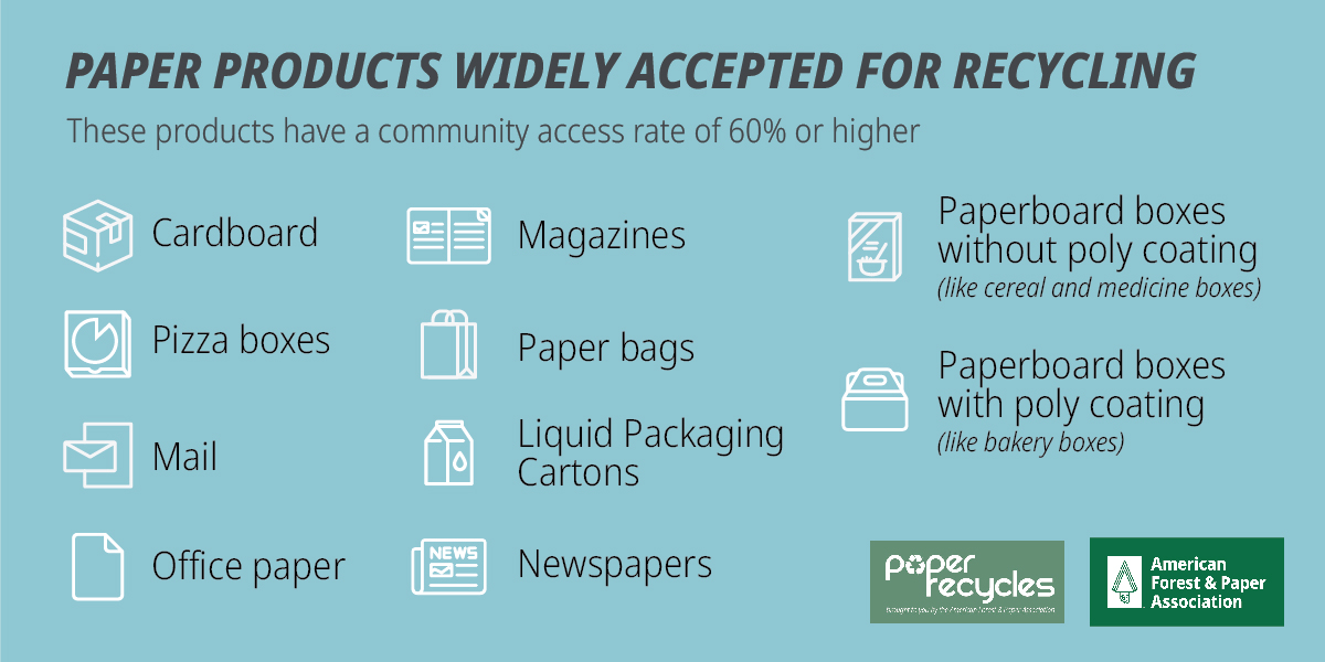 The 2021 AF&PA Access to Recycling Study found many items which are widely accepted. 60% or more of consumers have access to community recycling programs that accept these materials.
