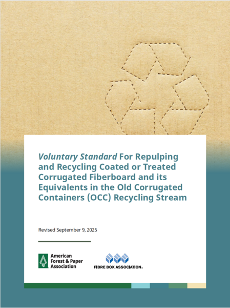 The Voluntary Standard updates the Voluntary Standard for Repulping and Recycling Corrugated Fiberboard Treated to Improve its Performance in the Presence of Water and Water Vapor, published in 2013.